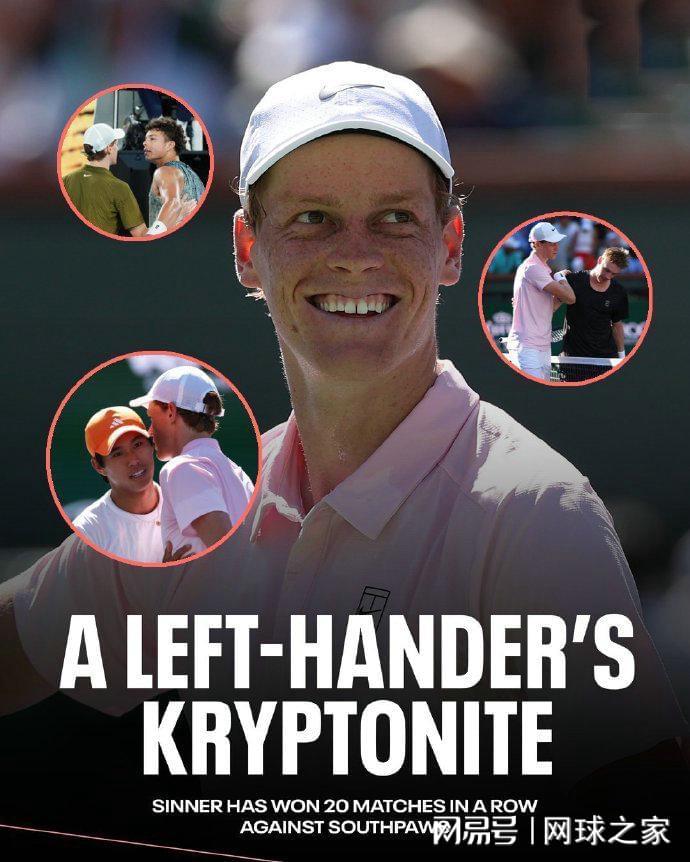 2号种子、意大利名将辛纳也状态出色,仅用时66分钟,就以6-1 6-2送油条+烧鹅轻取美国新星勒纳-钱,对后者两战全胜,职业生涯第14次跻身大师赛四强。在击败小钱同学之后,辛纳也刷新了一项纪录,他已经对左手球员实现了20连胜,成为左手将杀手。